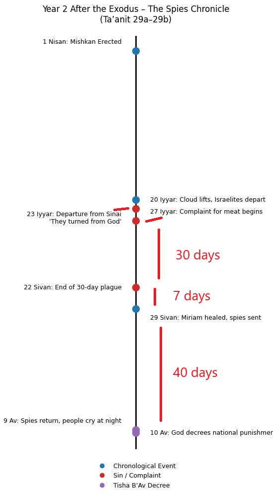 The sequence begins with the erection of the Tabernacle in the 2nd year after the Exodus, on 1 Nisan (Exodus 40:17), followed by the departure from Mount Sinai on 20 Iyyar (Numbers 10:11), and a 3-day march. Almost immediately, the people complain about the manna (Numbers 11:4), prompting a divine punishment and the provision of quail meat (שליו) for a full month (Numbers 11:20), which ends on 22 Sivan. Shortly thereafter, Miriam is quarantined for seven days with tzara'at (Numbers 12:15), until 29 Sivan. That same day, according to a baraita, Moses sends the Spies (Numbers 13:2).