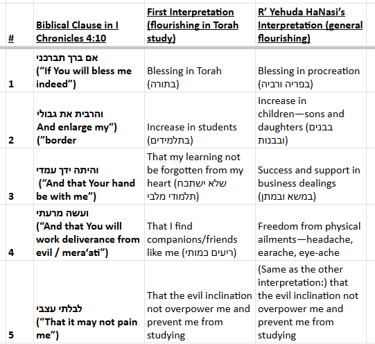 R’ Yehuda HaNasi - interprets Jabez’s prayer more literally: children; business success; health; righteousness