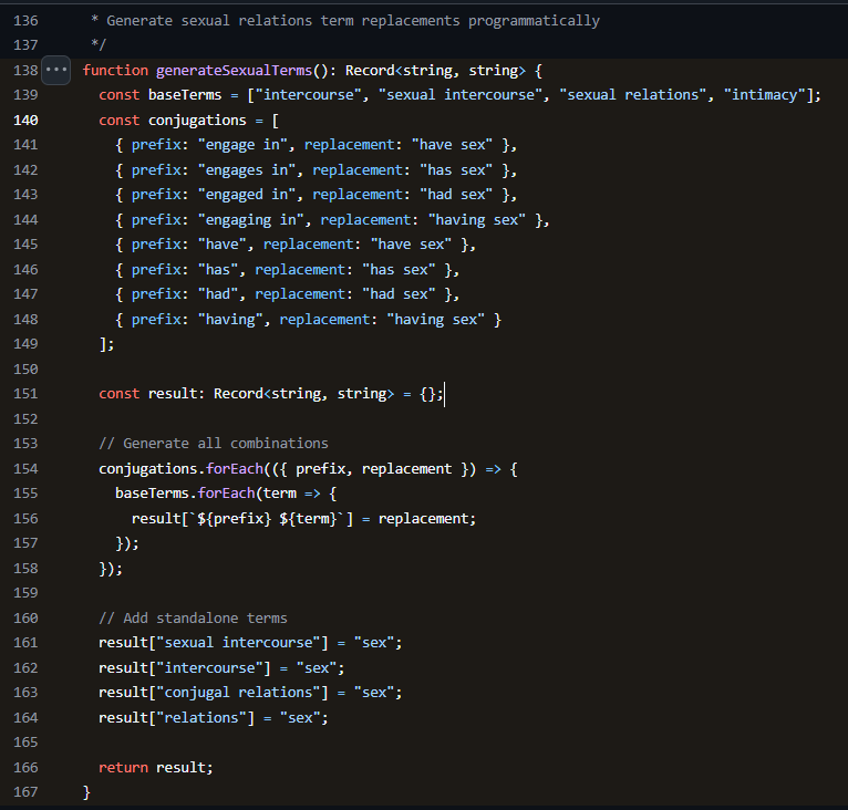 For complex term families, I use programmatic generation. The sexual terminology mappings, for instance, are generated by combining a list of base terms with a list of verb conjugations, producing all valid combinations without manual enumeration.