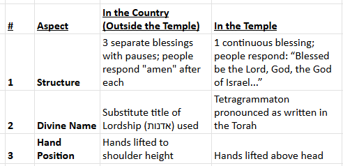 Three Differences Between Temple and Non-Temple Recitation of the Priestly Benediction: Structure of the Blessing; Use of God’s Name; Posture of the Hands; Dispute Over the High Priest’s Practice