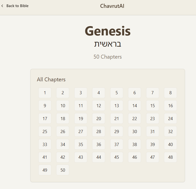 The interface preserves the sepia-toned aesthetic that characterizes the rest of ChavrutAI, creating visual continuity for users moving between Talmudic and biblical texts. This consistency extends to navigation patterns, with the same hamburger menu and breadcrumb system available throughout the platform.