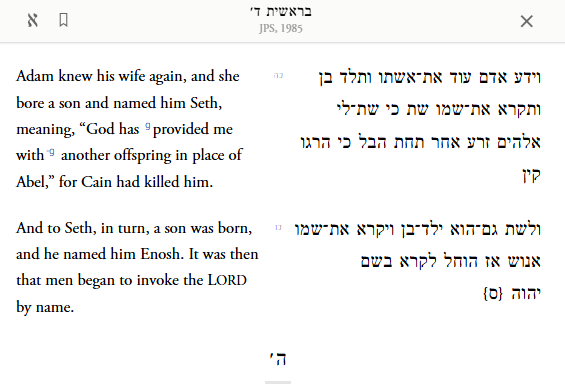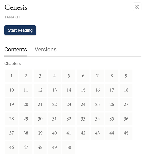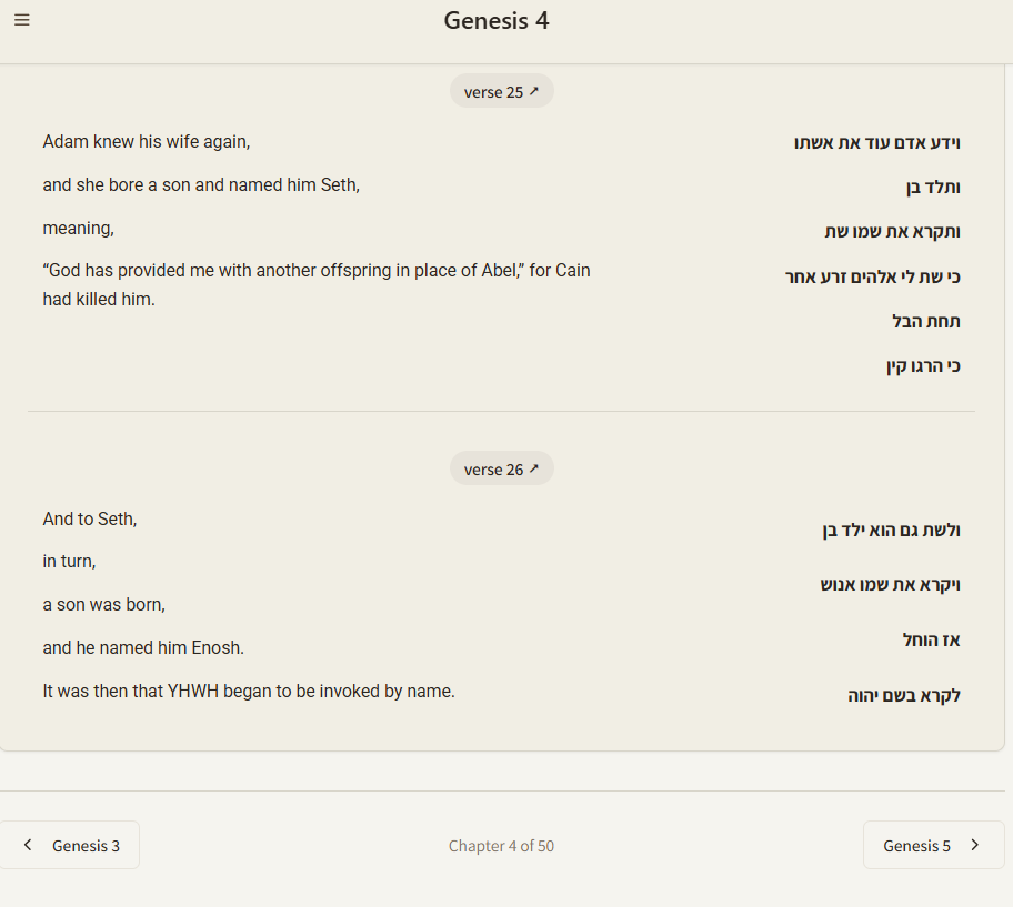 All biblical text comes from Sefaria.org through their public API. Hebrew text uses Sefaria’s default Masoretic text (Miqra according to the Masorah), while the English translation uses the 1985 Jewish Publication Society Tanakh. I chose the JPS 1985 translation (from the other translations available on Sefaria) for its scholarly rigor, contemporary English, and widespread acceptance in academic and religious study contexts.