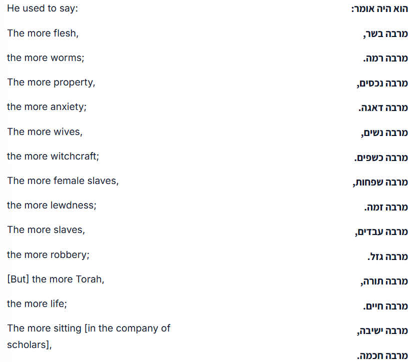 Sample Mishnah section, which shows the literary structure clearly, Avot 2:7 (see my piece on this Mishnah section in my “Appendix - More Of Hillel’s Aphorisms (Avot 2:4-7)”, section ““The more [X], the more [Y]” - A List of 9 items (2:7)”):