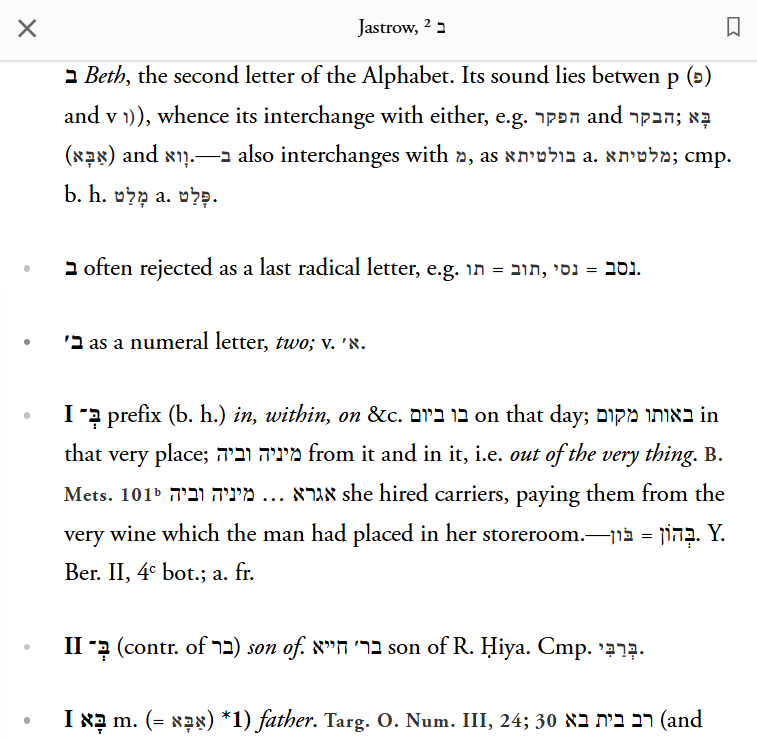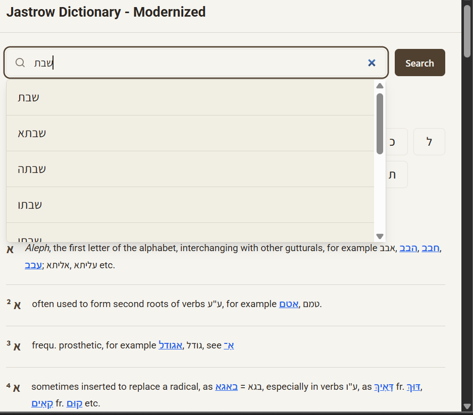 I built a web application that provides a modernized and enhanced interface for the Jastrow Talmudic lexicon.1 The goal was to make this important resource more accessible and easier to navigate than the existing Sefaria implementation (from which this draws, and is a “wrapper” of). And it's certainly an improvement over the traditional print or PDF versions.