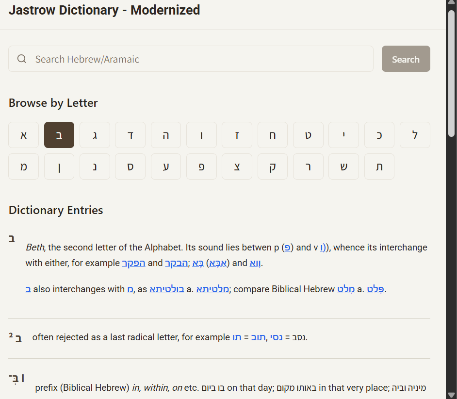 Like the Sefaria version, the application allows users to search for Hebrew and Aramaic words or browse entries alphabetically by Hebrew letter. When you search for a word, it retrieves the corresponding dictionary entry from the Jastrow lexicon, complete with definitions, grammatical information, and cross-references to biblical and rabbinic sources.