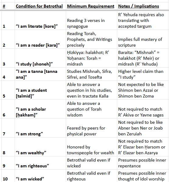 This sugya explores a series of conditional betrothals1 that turn on how terms like “literate,” “student,” “scholar,” “strong,” “wealthy,” “righteous,” and “wicked” are defined in rabbinic discourse.