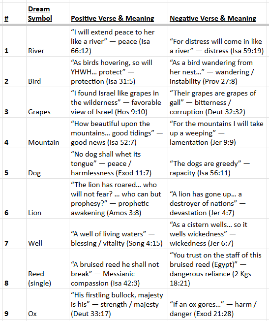 Dream symbols are interpreted with dual or multiple meanings, often contrasting good and bad outcomes. Key themes include symbols of peace, prosperity, Torah, and divine connection.