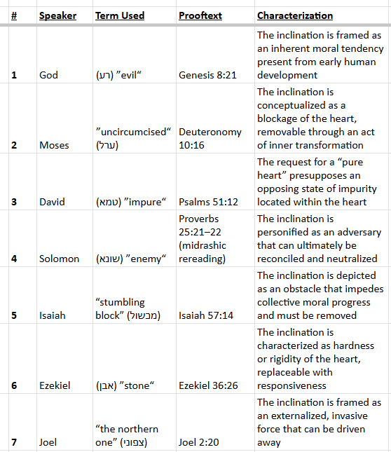 Next, R’ Avira / R’ Yehoshua ben Levi list seven names given to the evil inclination by different biblical figures: “evil” (God, Genesis 8:21); “uncircumcised” (Moses, Deuteronomy 10:16); “impure” (David, Psalms 51:12); “enemy” (Solomon, Proverbs 25:21–22, with a derash on yeshalem/yashlimenu); “stumbling block” (Isaiah 57:14); “stone” (Ezekiel 36:26); “hidden/northern one” (Joel 2:20). A baraita identifies Joel’s “northern one” as the evil inclination because it is “hidden” in the human heart.