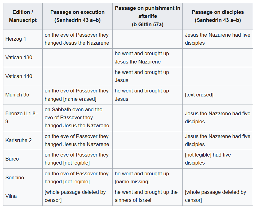 In general, see “Jesus in the Talmud“ (ibid.), section “Disputations and censorship“, sub-section “Text-criticism, versions, and alterations“: