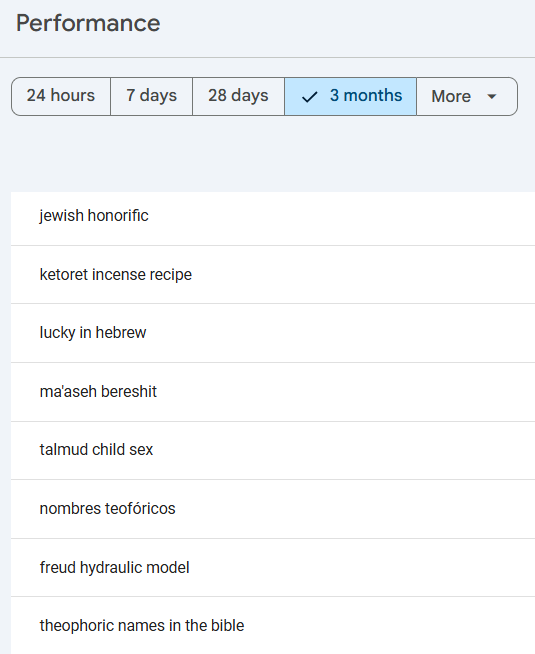 This post displays the top 30 queries and the most popular pieces on my website, according to Google. It also responds to the clear search interest in controversial Talmudic passages, as indicated by keyword analytics from this blog and ChavrutAI usage patterns.