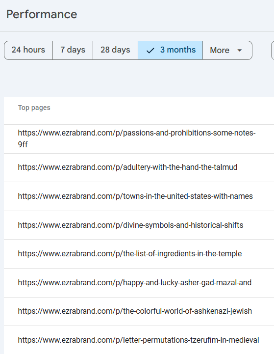 (According to Google Search Console,1 section “Performance” > “Queries”; after the queries “ezra brand” and “talmud”) :