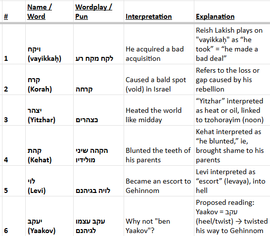 The sugya then turns to a close reading of the names and lineage in Numbers 16:1. Reish Lakish interprets each name in Korah’s ancestry as an allusion to moral or spiritual failure, framing the genealogy itself as an indictment. Rav Shmuel bar Rav Yitzḥak adds that Jacob’s name is deliberately excluded from Korah’s line due to a prayer in Genesis 49:6 distancing himself from future rebels.