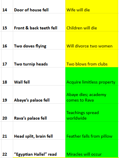 Rava’s Interpretation (Paid) - A List of 5 items - Wall fell, Abaye’s and Rava’s palaces fell, Head split and brain fell, Hallel read = Acquire limitless property, Abaye dies and academy comes to Rava, Teachings spread worldwide, Feather falls from pillow, Miracles will occur