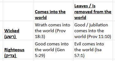 Baraita - When a wicked person arrives, wrath comes (Prov 18:3); When he dies, good comes (Prov 11:10); When a righteous person dies, evil comes (Isa 57:1); When a righteous person arrives, good comes (Gen 5:29)