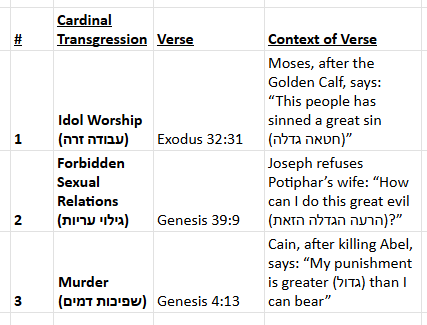 that when Potiphar’s wife attempted to seduce Joseph he responded: “How can I do this great (גדלה) wickedness, and sin against God” (Genesis 39:9).