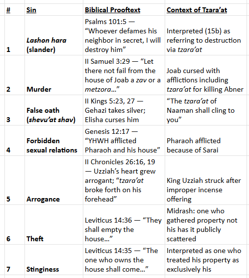 The sugya enumerates seven moral transgressions for which tzara’at serves as punishment, grounding each claim in a specific biblical verse, often with midrashic interpretation linking the affliction to the underlying ethical failing.