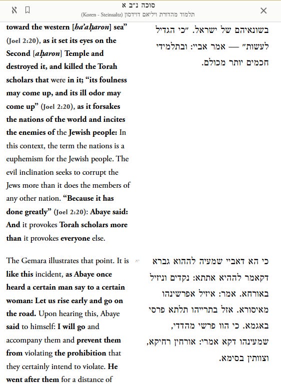 Open any page of Talmud and you’ll see walls of text. The Aramaic original is terse: sometimes a few words carry the weight of an entire argument. The ed. Steinsaltz English translation (via Sefaria) adds explanatory material, which helps comprehension but makes the text longer and harder to navigate.