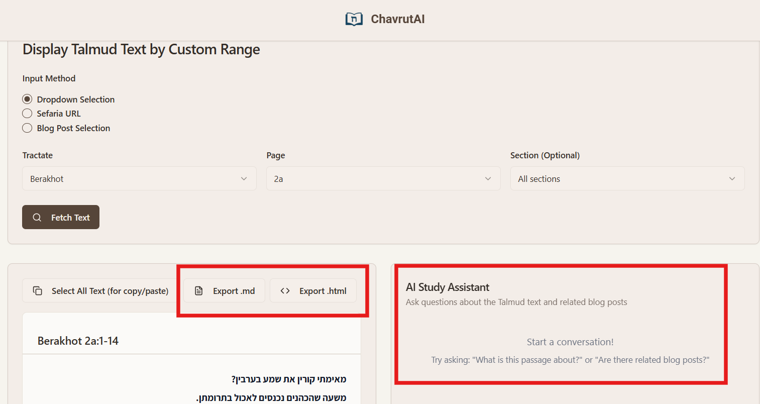 See the “Sugya Viewer Export Options” at the sugya viewer page, with the “AI Study Assistant” on the side; I highlighted the screenshot with red boxes: