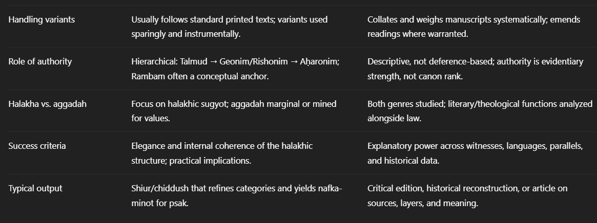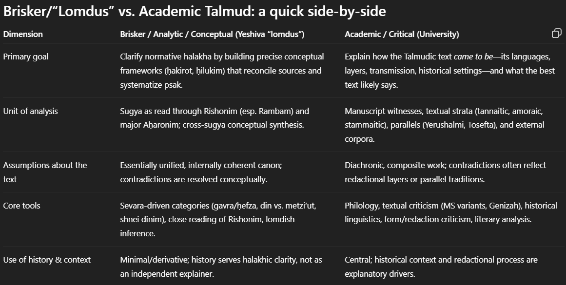 Brisker/“Lomdus” vs. Academic Talmud: a quick side-by-side
