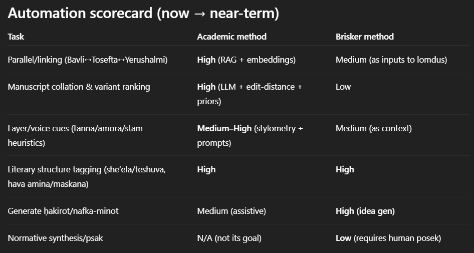 Bottom line: If you want dependable automation, push the academic pipeline to the max and let it feed a Brisker layer where the LLM is a copilot for hypotheses—not an automatic posek.
