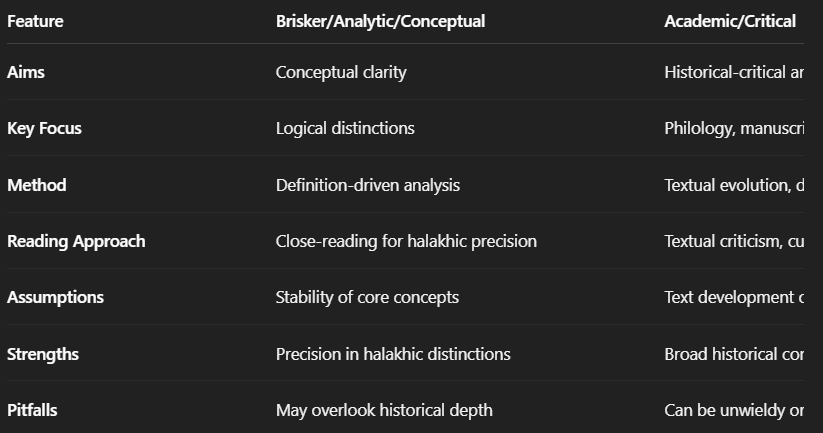 Assumptions about Text: Brisker prioritizes clarity of halakhic concepts; academics focus on historical context and textual evolution.