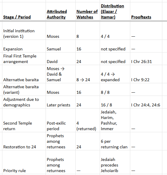 The sugya then outlines the historical development of these watches. Moses first established eight divisions — four descended from Eleazar and four from Ithamar, Aaron’s sons. Samuel expanded them to sixteen, and David finalized the permanent structure of twenty-four, a system grounded in biblical verses from I Chronicles (9:22; 24:4; 26:31).