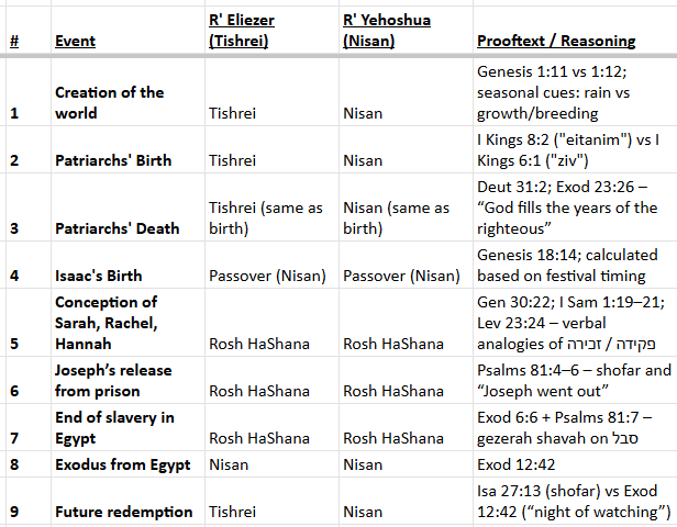 R' Eliezer roots key events in Tishrei, including Creation (list item #1),2 the Patriarchs’ birth and death (#2-3), and the future messianic redemption (#9). R' Yehoshua places the same events in Nisan.3